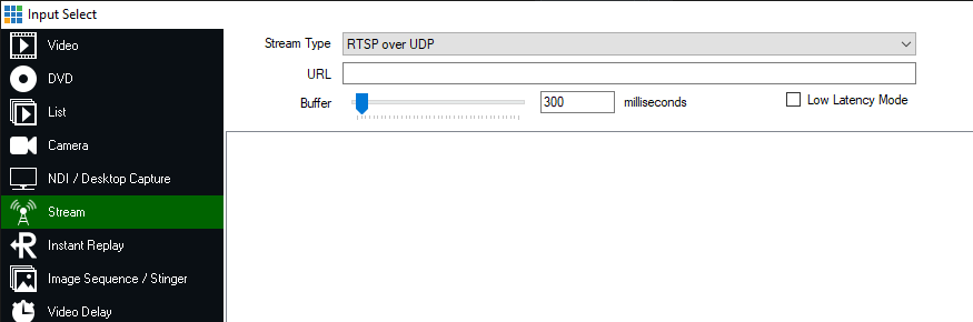 The Stream input supports adding IP Cameras and Streaming Servers that support the RTSP, Transport Stream or SRT protocols.